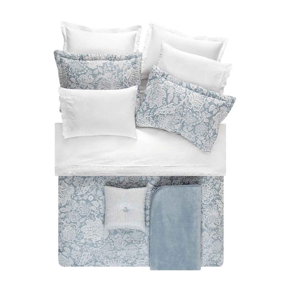 Lesion - Indigo Çeyiz Seti Modern Tasarıma Lüks Yorum Lesion Çeyiz Seti, çiçekli ve geometrik şekillerin birlikteliğiyle modern ve gelenekseli bir arada sunuyor. Pamuklu kumaşı, sağlıklı ve konforlu bir uyku deneyimi sağlarken dayanıklı yapısıyla da uzun süre yumuşaklığını korur. Canlı renklerden ve pastel tonlardan oluşan koleksiyonda Lesion Çeyiz Seti yatak odanızda dekorasyonunuzun bir tamamlayıcısı olacak Nakışlı Crep Nevresim: 200x220 cm (1 adet ) Çarşaf: 240x260( 1 adet) Yastık: 50x70 (4 adet) Yatak Örtüsü: 260x270 Cm ( 1 Adet) Yatak örtüsü Yastık Kılıfı 50x70 ( 2 adet) Dekoratif Kırlen :30x50( 1 Adet) Battaniye:200x240( 1 Adet)  | ![]()  |